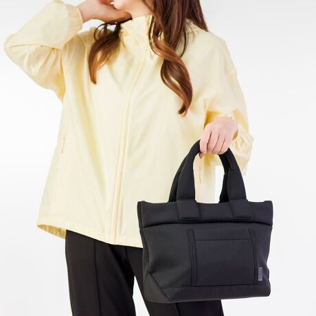 ふっくらとしたボリューム感のある軽量の生地を使用した小さめのトートバッグ。程よい伸縮性のあるウェットスーツ風の生地を使用した太めのハンドルが腕や肩への負担を軽減してくれます。メイン収納部は安心のファスナータイプを採用しました。正面のオープンポケット右下にはロゴを型押ししたバッグと同色のタグが付いています。ちょっとしたお出かけに最適なバッグです。