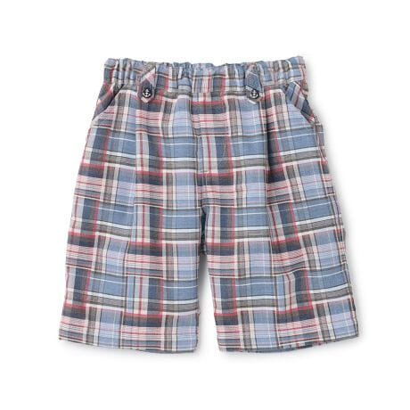 やわらかくさらりとした肌当たりが心地よいチェック柄の6分丈パンツです。タックを入れてすっきりと見せつつ、ゆとりのあるシルエットに仕上げました。フロントのベルトループには、アンカーの飾りボタンでさりげないアクセントをプラス。ウエストはアジャスターつきのゴム仕様で、スムーズなお着替えが叶います。内側にお名前を記入できるタグつき。【おすすめの着用時期は春夏シーズン】