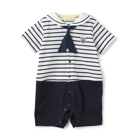 さわやかなセーラーデザインが可愛いショートオールです。胸元にアンカーのワッペンをあしらい、マリンテイストに仕上げました。スカーフはスナップボタンでつけ外しできるので、お着替えもラクラク。UVカット機能を備えており、紫外線対策にも活躍するアイテムです。やわらかく肌当たりの良いコットン100%素材を使用しました。【おすすめの着用時期は春夏シーズン】