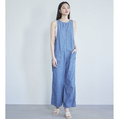 一枚で夏のオシャレが完成する、カーブシルエットのアメリカンスリーブオールインワンです。肩やデコルテ、背中をヘルシーに露出することで、デニムのカジュアルさの中に、女性らしい抜け感と涼しげな印象をプラス。曲線的なカッティングが特徴で、大人の女性でも上品に着こなしやすいシルエットに仕上げました。大きめなフロントポケットは、気になるモモ周りをさりげなくカモフラージュ。リラックス感のあるシルエットながら、一枚でサマになる存在感があり、暑い夏のオシャレにぴったりのアイテムです。