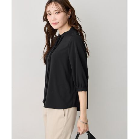 [型番:353859]上品に着こなすタックブラウス肌触りのよいジョーゼット素材で、軽やかに着られる前開きブラウス。前身頃のタックがさりげなく立体感を生み、きちんとした印象に仕上げてくれます。七分袖で手元がすっきり見え、黒需要にも対応しやすい一枚。ジャケットのインナーとして通勤スタイルに取り入れたり、一枚着で上品にまとめる着こなしもおすすめです。