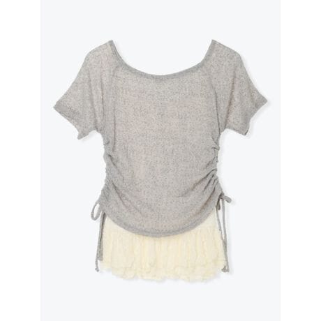 [型番:26560787806]くしゅっとしたシャーリングトップスと裾レースのキャミソールがセットになったアイテム。トップスのサイドは絞ることで印象の変化を楽しめます。ゆったりとしたネックラインがデコルテを美しく見せるのもポイント。組み合わせて着用したり、単品でも活躍するアイテムです。