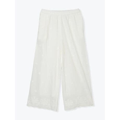 [型番:26410715948]やわらかなメン素材に、さりげない刺しゅうを散りばめたパネルデザインのパンツ。裾のスカラップとレース調のディテールが、軽やかで女性らしい印象を引き立てます。シンプルなブラウスを合わせて上品にまとめたり、ゆったりとしたトップスを合わせてリラックス感のある着こなしもおすすめ。抜け感のあるスタイルが楽しめる1着です。Hare no hi/ハレノヒ