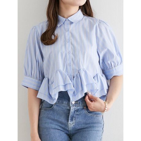 [型番:26560788557]ストライプ柄に裾フリルをあしらった、軽やかな印象のショート丈ブラウス。コンパクトなシルエットと立体感のあるフリルが、スタイリングに華やかさをプラスします。ハイウエストのワイドパンツを穿いてバランスよくまとめたり、タイトスカートを合わせてシルエットを引き立てる着こなしもおすすめ。モデル(ピンク/A柄着用)身長:165cmMサイズ着用