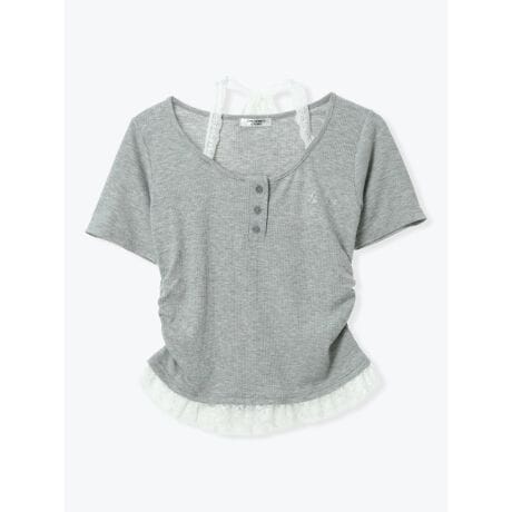 [型番:26560787898]やわらかなリブ素材に、裾と襟元のレースを切り替えたヘンリーネックトップス。コンパクトなシルエットにさりげない刺しゅうを添え、女性らしいバランスに仕上げています。カーゴパンツを合わせて甘さを程よく抑えた着こなしもおすすめ。レイヤード風デザインで1枚でもサマになるアイテムです。モデル(B柄着用)身長:162cmMサイズ着用