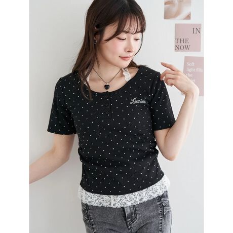 [型番:26560787898]やわらかなリブ素材に、裾と襟元のレースを切り替えたヘンリーネックトップス。コンパクトなシルエットにさりげない刺しゅうを添え、女性らしいバランスに仕上げています。カーゴパンツを合わせて甘さを程よく抑えた着こなしもおすすめ。レイヤード風デザインで1枚でもサマになるアイテムです。モデル(B柄着用)身長:162cmMサイズ着用