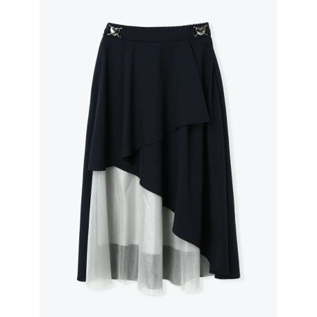 [型番:26550741563]ハートモチーフの金具がアクセントになった、ラッフルデザインのミディスカート。アシンメトリーに重なるフリルとシアー素材のレイヤードが、動きのある表情を演出します。コンパクトなトップスをインしてシルエットを引き立てたり、ショート丈トップスを合わせてバランスよくまとめる着こなしもおすすめ。モデル(ピンク着用)身長:165cmMサイズ着用