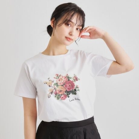 胸元に描かれたアンティーク調のフラワーブーケが目を引くカットソーです。