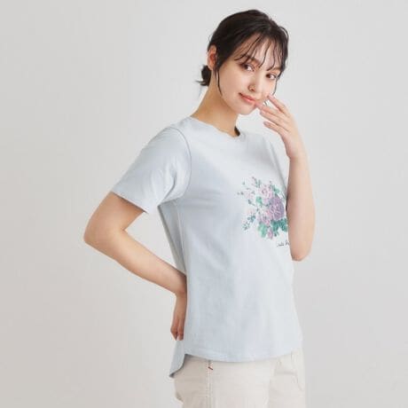 胸元に描かれたアンティーク調のフラワーブーケが目を引くカットソーです。