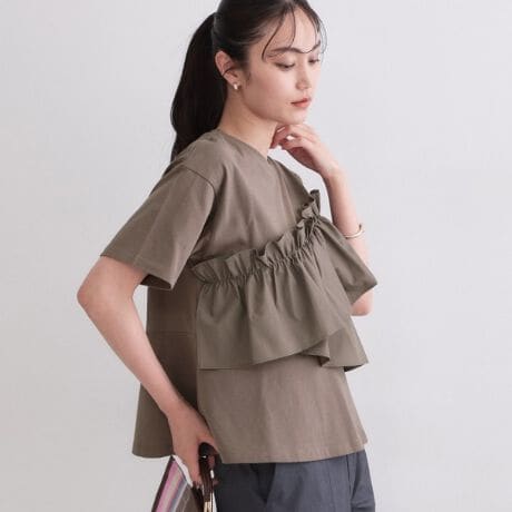・アシンメトリー状にシャツ素材のフリルをあしらった、華やかなドッキングカットソー。