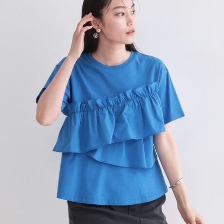 ・アシンメトリー状にシャツ素材のフリルをあしらった、華やかなドッキングカットソー。