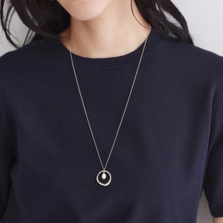 サークルモチーフの中でパールが揺れる、軽やかでエレガントなデザインが特徴のネックレス。