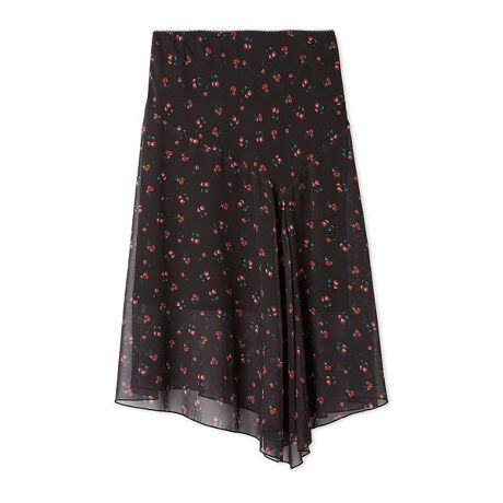 夏の日差しに映える瑞々しいフルーツ柄を、軽やかなシフォン素材にのせたフレアスカート。愛らしいチェリー柄と、ブルーベリーをイメージしたカラーリングのドット柄の2バリエーションでご用意しました。計算された美しいシルエットは、歩くたびにドラマチックな揺れ感を生み出し、女性らしさを引き立てます。軽やかな素材感ながら、合わせるアイテム次第で季節を問わず着用いただける万能な一着です。