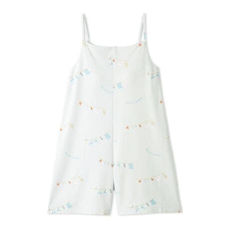夏のお洗濯をテーマに描いたユニークなプリント柄に心なごむ、サマーランドリーシリーズです。抗菌防臭加工のベア天竺を使用した、総柄プリントのショート丈オールインワン。右後ろにポケットを付け、肩紐の長さはアジャスターで調整可能。カップイン仕様なので、1枚で涼しく着用していただけます。ポイントは、PIQUEのTシャツやビーチサンダルがぶら下がったお洗濯シーンの絵柄。よく見るとヒトデやカニを干していたり、カモメがちょこんとひと休みしています。色は淡いグリーンとブルーの2色を揃えました。