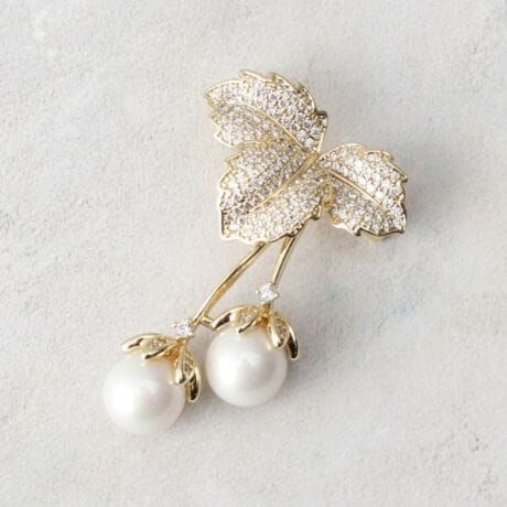 きらめくリーフモチーフの下に、ぷっくりとしたベリー型のパール調パーツが揺れるブローチです。