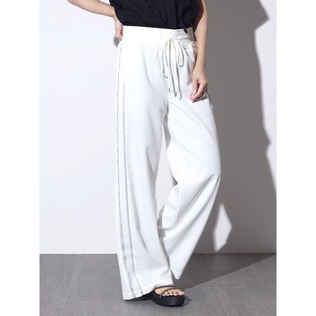 サイドに施したラインデザインが縦のラインを強調し、ストレートシルエットと相まって脚をすっきりと見せる効果も。