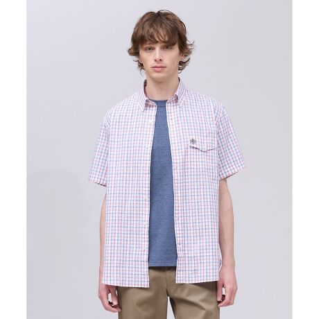 ■素材 コットンポリエステルのチェック柄シアサッカー。縦糸を等間隔で抜いて織り上げた空羽(あきは)と呼ばれる生地を使用。糸を抜いた部分と抜いていない部分でランダムなデコボコ(シボ)ができ、空羽独特の軽い風合いと通気性を生み出します。見た目も柔らかく、優しい雰囲気と艶やかさ、軽やかなエアリーな着心地と佇まいを体感できるのが特徴。吸湿速乾機能をもつCOOL MAXポリエステルの糸を使用し、更に後加工で接触冷感の機能をプラス。