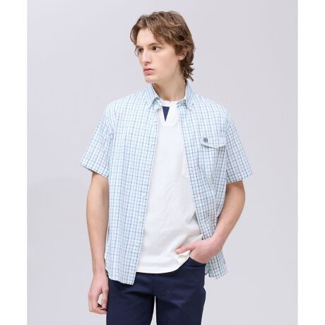 ■素材 コットンポリエステルのチェック柄シアサッカー。縦糸を等間隔で抜いて織り上げた空羽(あきは)と呼ばれる生地を使用。糸を抜いた部分と抜いていない部分でランダムなデコボコ(シボ)ができ、空羽独特の軽い風合いと通気性を生み出します。見た目も柔らかく、優しい雰囲気と艶やかさ、軽やかなエアリーな着心地と佇まいを体感できるのが特徴。吸湿速乾機能をもつCOOL MAXポリエステルの糸を使用し、更に後加工で接触冷感の機能をプラス。