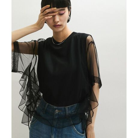 カットソーにシアー感のあるチュールを重ねた、掛け合わせのデザインが魅力のデザインTシャツ。