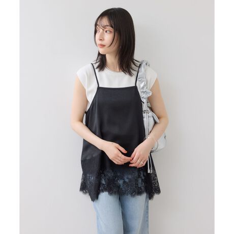 ・表面感のあるサテン×レースの組み合わせが華やかなキャミトップス