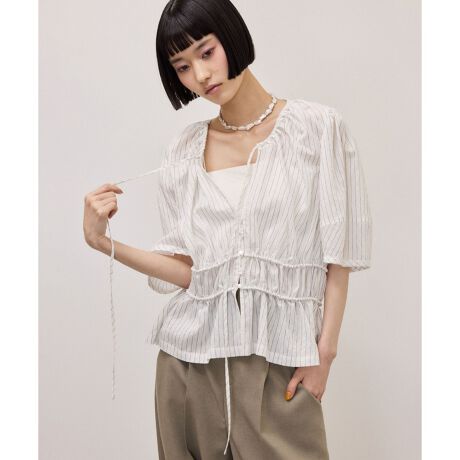 ウエストにゴムギャザーを施した、エアリーなストライプブラウス。