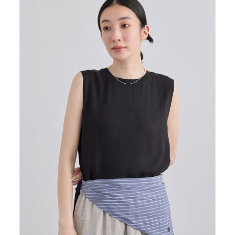 上品な光沢のツイル素材をTシャツ感覚で気軽に着られるデザインに落とし込んだノースリーブブラウス。程よくゆとりのあるシルエットでリラクシーな着心地ながら、シックな印象に仕上げています。