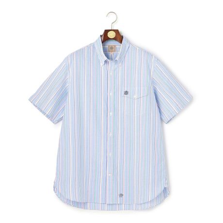■素材 コットンポリエステルのマルチストライプ柄シアサッカー。縦糸を等間隔で抜いて織り上げた空羽(あきは)と呼ばれる生地を使用。糸を抜いた部分と抜いていない部分でランダムなデコボコ(シボ)ができ、空羽独特の軽い風合いと通気性を生み出します。見た目も柔らかく、優しい雰囲気と艶やかさ、軽やかなエアリーな着心地と佇まいを体感できるのが特徴。吸湿速乾機能をもつCOOL MAXポリエステルの糸を使用し、更に後加工で接触冷感の機能をプラス。見た目と着心地の快適さが魅力の、夏に相応しい半袖シャツです。