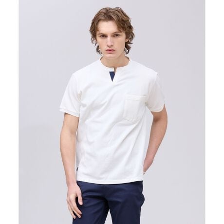 ■仕様襟元のキーネック仕様や、胸元のポケットなど、1枚でも着映えるデザイン。裾口にはブランドオーバルロゴ刺繍を配し、さりげないアクセントに。さらに製品染をすることでカジュアルな雰囲気に仕上げました。