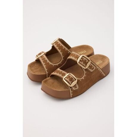 [型番:350JS137-7800]トレンド感満載なプラットフォームサンダル。安定感と程よい高さの厚底ソールがスタイルバランスも取りやすい旬なデザイン。軽量かつもっちりとした低反発のカップソールで包み込まれるような履き心地。さらにベルト部分は調節ができるのも◎(前ベルトは穴タイプ・甲ベルトはベルクロタイプ)立体感のあるウエスタン調の刺繍&スタッズもポイントです。春先から秋口までシーズン長く履いていただきます。