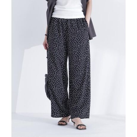 トレンド感のあるドット柄が目を引くリラクシーパンツ。ゆるニットと合わせたラフなスタイリングで、こなれた印象に見せてくれます。ウエスト内側の紐でサイズ調整ができ、サイドスラッシュポケット付きで実用性もあります。ヒップまわりには薄い生地を施し、ラインをカバーしてくれる安心感のあるはき心地です。<素材>柔らかくドレープ性のある薄手の素材を使用しています。<詳細>仕様・開閉なし裏地・あり透け感・ややあり / 光沢・ややあり / 伸縮性・なし生地の厚さ・薄手※モデルの着用画像の場合、光の当たり具合により、実際の色味と異なって見えることがございます。色味は、商品単体の画像をご参照ください。