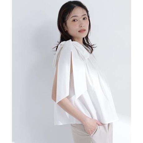 【ちょうど、いい服】「それどこの?」って聞かれちゃう大ぶりのリボン&たっぷりとしたギャザーのときめきブラウス。取り外し可能なリボンでさりげなく二の腕カバーも。□UVカット□マシンウォッシャブル取り外し可能なショルダーリボンがポイントのブラウス。肩裏のループに共地リボンを通し、肩山で大きくリボン結びにして垂らす着こなしがおすすめ。リボンを外せば、すっきりとしたノースリーブブラウスとしても着ていただけます。身頃にはギャザーを入れ、フェミニンで華やかな雰囲気に。ストレートパンツやデニムなど、すっきりとしたボトムスにアウトで合わせるスタイリングがおすすめです。<素材>マシンウォッシャブル、UVカットを備えた、程よくハリ感のあるブロード素材を使用しています。<詳細>仕様・開閉なし裏地・なし透け感・なし / 光沢・なし / 伸縮性・なし生地の厚さ・普通※モデルの着用画像の場合、光の当たり具合により、実際の色味と異なって見えることがございます。