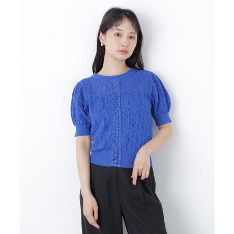 フロントをレースで切り替えたシアー感が涼しげで華やかなニット。華奢な地柄編みとドライタッチな素材感で、涼しげで軽やかな印象に見せてくれます。襟ぐりもレースのような編地で仕上げた上品なデザイン。フェミニンになりすぎず、カジュアルなスタイリングにもおすすめです。<素材>ドライタッチでシャリ感のある素材を使用しています。<詳細>仕様・開閉なし裏地・なし透け感・あり / 光沢・ややあり / 伸縮性・あり生地の厚さ・薄手※モデルの着用画像の場合、光の当たり具合により、実際の色味と異なって見えることがございます。色味は、商品単体の画像をご参照ください。