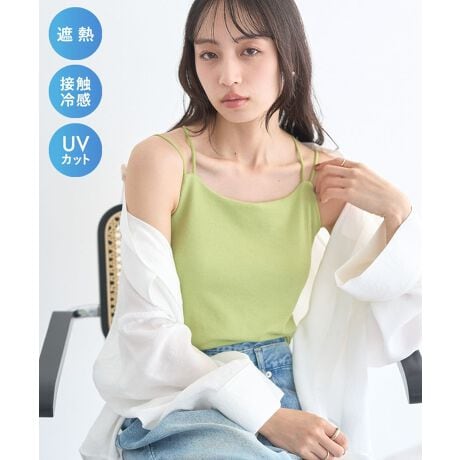着心地の良さと機能性を兼ね備えたキャミソールは、毎日のコーデに欠かせない一枚です。カップ付きなので一枚で着用でき、忙しい朝もさっと準備が整います。カップが縫い付けられているのでバストが横流れしにくく、自然できれいなシルエットをキープしてくれます。テレコ素材が程よく伸びて体にフィットし、動きやすさも抜群です。UVカットや接触冷感、遮熱機能が備わっているため、日差しの強い日でも安心して着用できます。シンプルなデザインで重ね着にも使いやすく、カジュアルからきれいめまで幅広く対応できるのが魅力です。