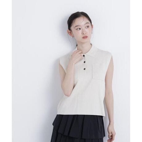 華やかで繊細なラメ糸を使ったポロ襟ディテールがポイントのノースリーブニット。肩先にさりげなくかかる袖丈と体のラインを拾いにくいシルエットが、これからの季節にぴったり。ワイドパンツからスカートまで、幅広いボトムスと着回せます。<素材>シャリッとした清涼感のある糸を使用しています。<詳細>仕様・前ボタン裏地・なし透け感・ややあり / 光沢・あり / 伸縮性・あり生地の厚さ・普通※モデルの着用画像の場合、光の当たり具合により、実際の色味と異なって見えることがございます。色味は、商品単体の画像をご参照ください。