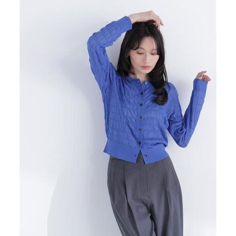 シアー素材にシャーリングをあしらった表情ゆたかなカーディガン。クルーネックのすっきりとしたデザインで、軽やかに羽織れる一枚です。フロントの配色ボタンがさりげないアクセント。冷房対策や日よけなど、季節の変わり目にも活躍でき、発色のキレイなカラーもポイントです。<素材>シアーな天竺編みにシャーリングを組み合わせた編地です。<詳細>仕様・前ボタン裏地・なし透け感・あり / 光沢・なし / 伸縮性・あり生地の厚さ・普通※モデルの着用画像の場合、光の当たり具合により、実際の色味と異なって見えることがございます。色味は、商品単体の画像をご参照ください。
