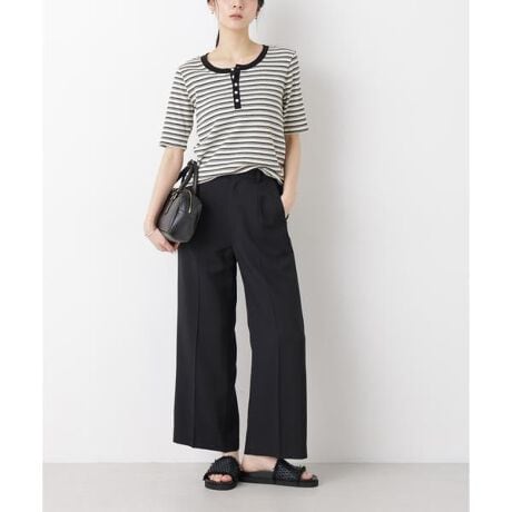 ノータックで腰回りをすっきりとさせたワイドなシルエットのロングパンツ。ざっくりとした表情が涼しげで、キレイな表面感も備えたバーズアイ素材を使用。同素材展開のトップスとのセットアップスタイルもおすすめです。