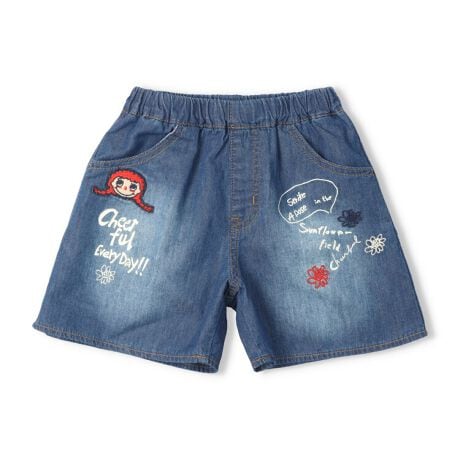 ダディコのワッペンとロゴのプリント、お花の刺繍。3分丈のデニム素材のショートパンツ。【アイテム】ナチュラル シンプル ベーシック フェミニン ガーリー 無地 カジュアル お洒落 オシャレ かわいい 大人可愛い 普段着 デイリーウェア お出かけ着 お外着 外遊び着 ハーフパンツ 短パン 半パン 半ズボン ボトムス 子ども こども 女児 女の子 ガールズ キッズ ベビーサイズ トドラーサイズ 幼稚園 保育園 小学校 通園 通学 小学生 2026年春夏物新作 丸高衣料 ショーパン ブルー 青色 ダディオダディ コットン100% 綿100%
