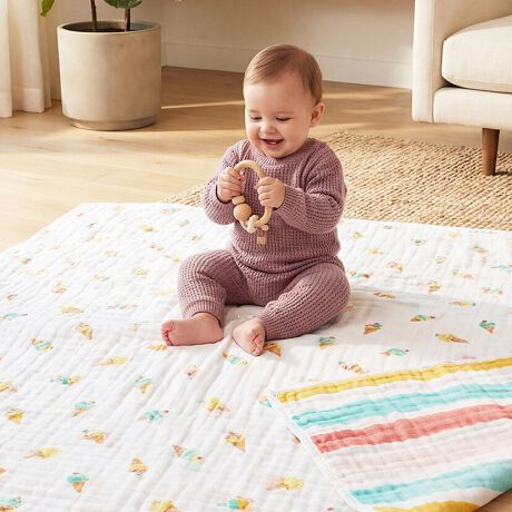 厚みがあり、やさしい肌ざわりで赤ちゃんを快適にサポートします。通気がよくムレにくいため、体温調整が苦手な赤ちゃんにも安心です。大判サイズでくつろぎタイムにぴったり。お出かけ時やオムツ替えマット、プレイマットとしてなど多用途に使えます。洗濯機で簡単に洗え、乾きやすいので、いつも清潔に保てます。