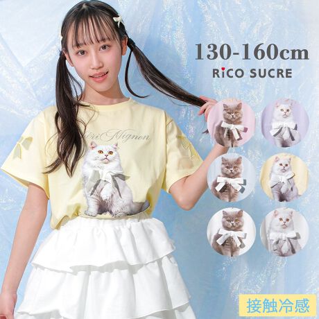 接触冷感リボン付き転写猫Tシャツ トップス 半袖 子供服 女の子