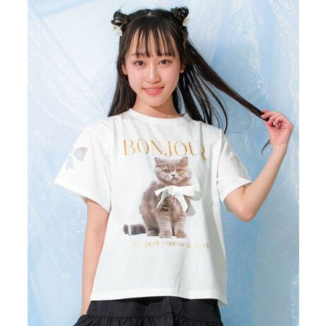 マルイウェブチャネル   /   トップス   /   Tシャツ・カットソー   /   接触冷感リボン付き転写猫Tシャツ トップス 半袖 子供服 女の子