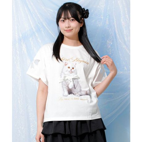 【item info】フロントに大きく入った猫の転写プリントが目を引く、存在感たっぷりのTシャツ。プリント部分にはリボンをあしらい、カジュアルな中にガーリーな可愛さをプラス。写真風の転写デザインで、トレンド感のあるおしゃれな印象に仕上げています。デニムやショートパンツで元気に、スカートと合わせて甘めコーデにも◎通学やお出かけにぴったりな、毎日着たくなる一枚です。