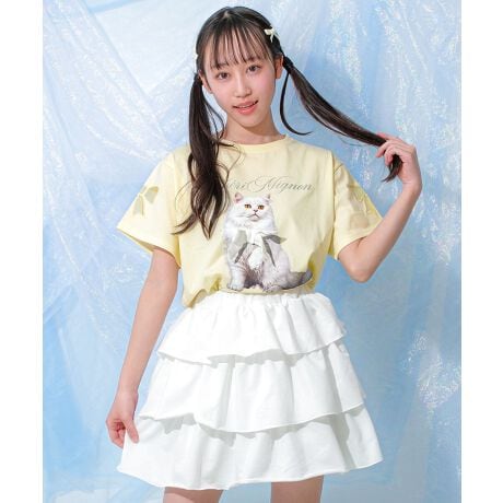 【item info】フロントに大きく入った猫の転写プリントが目を引く、存在感たっぷりのTシャツ。プリント部分にはリボンをあしらい、カジュアルな中にガーリーな可愛さをプラス。写真風の転写デザインで、トレンド感のあるおしゃれな印象に仕上げています。デニムやショートパンツで元気に、スカートと合わせて甘めコーデにも◎通学やお出かけにぴったりな、毎日着たくなる一枚です。