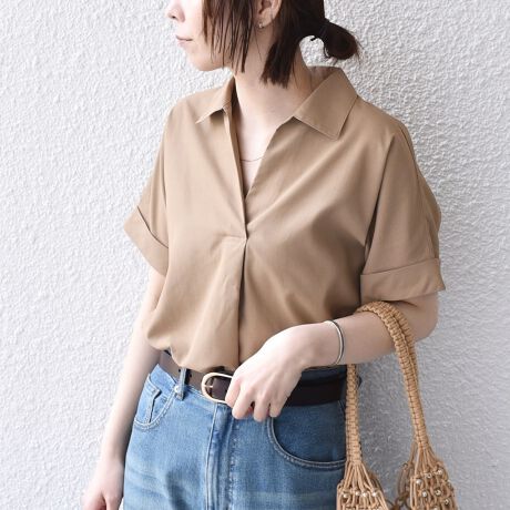 スキッパーデザインと、着ると丸みのあるシルエットがポイントのシャツ。