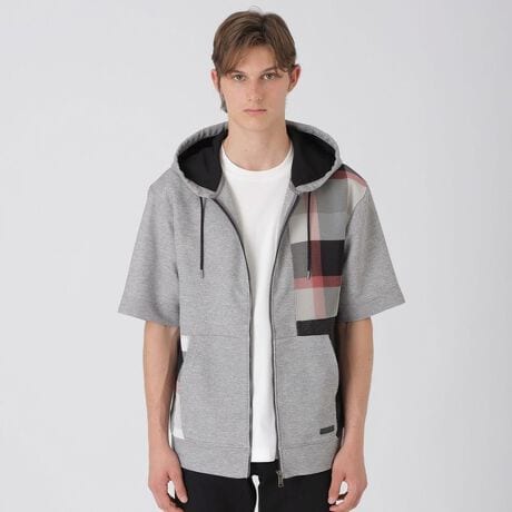 ・フロントをパッチワーク状に切り替えた存在感のある半袖パーカー