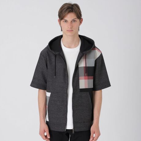 ・フロントをパッチワーク状に切り替えた存在感のある半袖パーカー