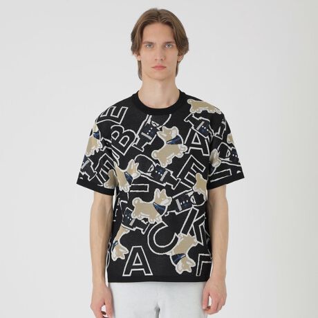 ・イギリスを象徴する「ガーズマン(衛兵)」、イギリス原産の犬「コーギー」、ブランドロゴを大胆に散りばめた、総柄のジャカードニットTシャツ。