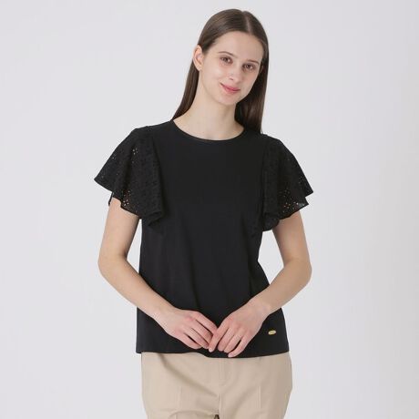 [型番:55P12752__]◆シンプルなボディにレースの袖が映えるデザインカットソー【Design】袖にあしらったコットンレースがポイントのカットソー。刺繍入り綿レースのラッフル袖が華やかな印象を与え、1枚でスタイリングの主役になるアイテムです。デニムアイテムとの合わせがおすすめで、きれいめカジュアルなスタイリングが簡単に完成します。【Fabric】本体:接触冷感を備えた素材です。