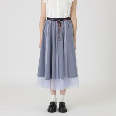 [型番:55S08791__]◆動くたびに表情を変える上品チュールスカート【Design】裏地と表地チュールをあえて色さをつけグラデーションを演出したチュールスカートです。歩くたびに表情を変えるチュールがエレガントなニュアンスを感じさせる1枚です。ウエスト部分にはゴムを使用し、ストレスフリーに着用していただけます。チェックのリボンベルトは取り外し可能です。