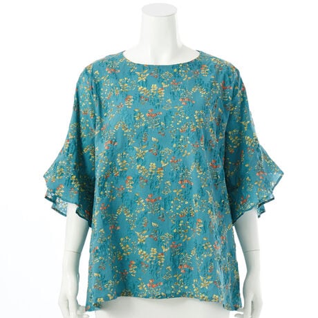 [型番:99115]サラッとした綿ローンに塩縮加工された心地よいナチュラル素材で、上品な小花プリントのチュニックブラウスです。袖はすっきり見え効果のフレア切替です。【価格】19,800円(税込)【ブランド】クインティ99115)【素材】綿100%【サイズ展開】F2(17〜19号)F4(21〜23号)