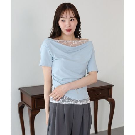 優雅な曲線を描くドレープネックと、繊細なレースを組み合わせた、一枚でクラスアップが叶うデザインカットソー。